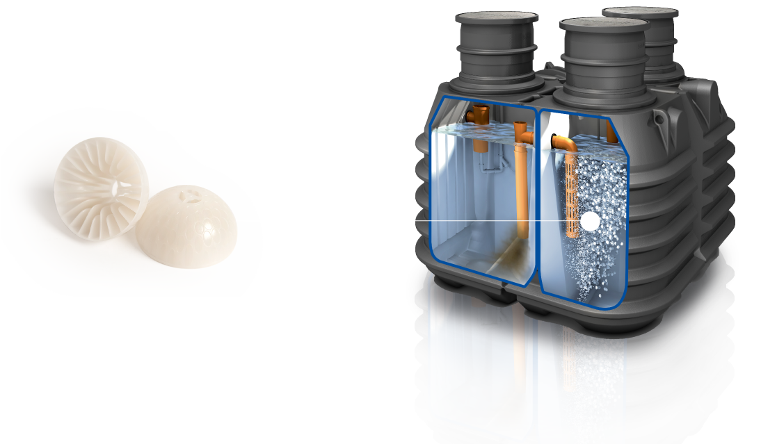 Eine verschleißarme Lüfterkerze leitet Sauerstoff in die Biokammer ein. Dabei entsteht eine freie Wirbelbewegung, die den Biofilm optimal mit Sauerstoff versorgt. - Überläufe
